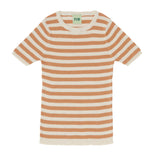 Dieses Kurzarm-T-Shirt ist in einer robusten Rippenstruktur gestrickt und ein FUB-Klassiker in Ecru/Apricot. Es hat eine gerade, schmale Passform und ist mit einem gerippten Rundhalsausschnitt und transparenten Webkanten am Ende der Ärmel und am unteren Saum versehen. Diese Bluse ist in einem klassischen Streifen gestrickt und aus Bio-Baumwolle hergestellt. Bio-Baumwolle wird aus gentechnikfreien Pflanzen angebaut und geerntet, ohne den Einsatz von chemischen Düngemitteln und Pestiziden.