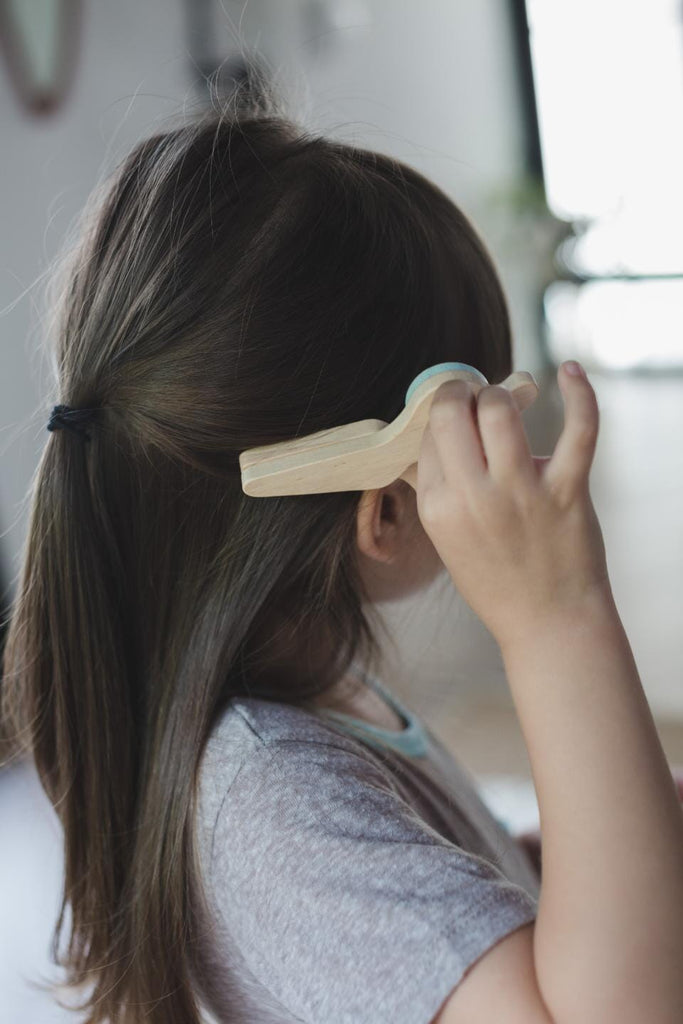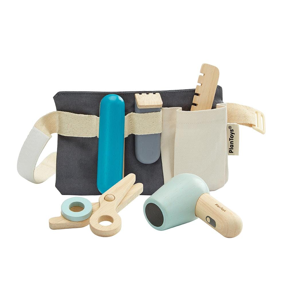 Hairdresser set from PlanToys. Let your imagination run wild and become a professional hairdresser with this enchanting Hairdresser Set! Complete with scissors, a hairdryer, comb, straightener, clippers and a waist bag, children can enjoy hours of creating trendy hairstyles for themselves, family members, friends or dolls. Develop communication skills by asking, discussing and describing hairstyles while cutting, trimming and styling.