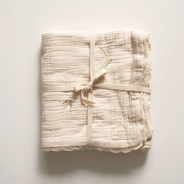 Clover hand embroidered clovers with lace by Gentil Coquelicot. Beautiful handmade sheet in organic muslin, double lined. Gentil Coquelicot Paris is a French brand that makes beautiful hand-embroidered creations for babies and children. The Gentil Coquelicot Paris brand works with...