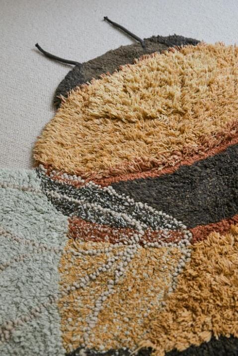 Washable rug Bee by Lorena Canals. Transform little ones' room into a world of play and learning with this Bee rug! Not only is this rug fun, it is the perfect companion for exploring the fascinating world of bees and their crucial role on our planet. A bee silhouette rug, with wings and its striped body in honey and dark grey colours, will become the new friend for your little one's room. Part of the bee is extra fluffy with a longer pile and is finished with dark grey cords as antennae and legs.