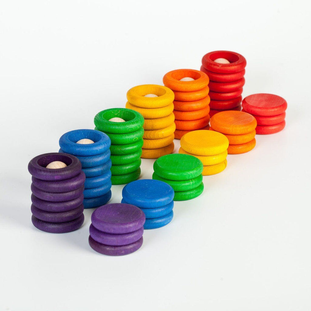 Wooden play set with nins, rings and coins from Grapat.