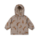 Mismou jacket in the Tiger Oak print by Konges Sløjd. This is a functional jacket with excellent waterproof and windproof properties. The jacket has a detachable hood and elasticated cuffs. Other functional details include zip pockets, an adjustable waist and an inner snow skirt (this is an extra strip of fabric in the lining of the jacket that you fasten around your waist to prevent snow and cold air from getting under your jacket during activities in the snow). The hooks for gloves on the inside of the sleeve ends are also practical!