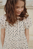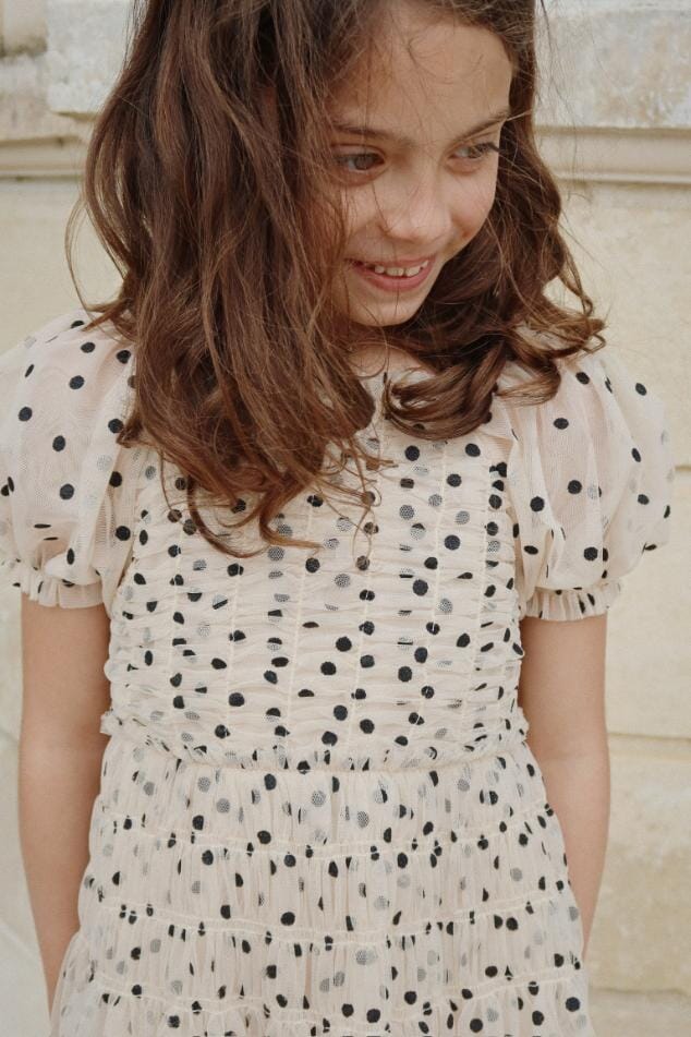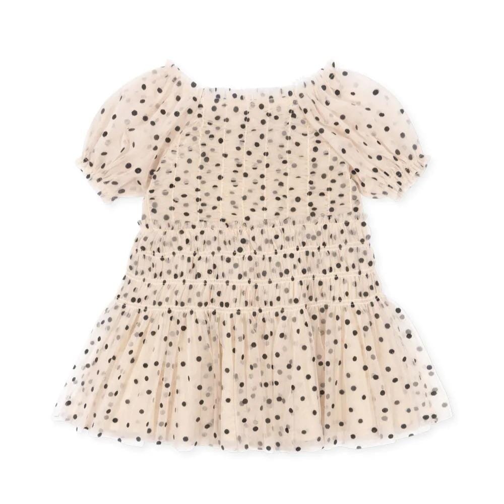 Tulle dress with polka dot print from Konges Sløjd. The Charlene dress in ecru has short puff sleeves a smocking effect.