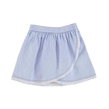 Short skirt in light blue, soft denim from Piupiuchick. The skirt has a crossed front and hem with fringes.