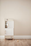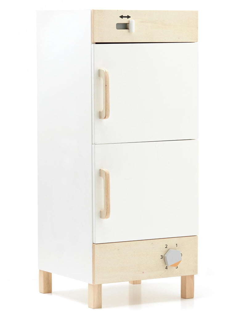 Refrigerator and freezer from Kid's Concept. Children will have lots of fun storing groceries with all the usual compartments you find in your refrigerator and freezer at home. Two shelves on the inside of the door, one with two egg holders and an extra drawer at the bottom for fruit and vegetables. Slide switch to adjust the refrigerator temperature. An on/off button with a click sound.