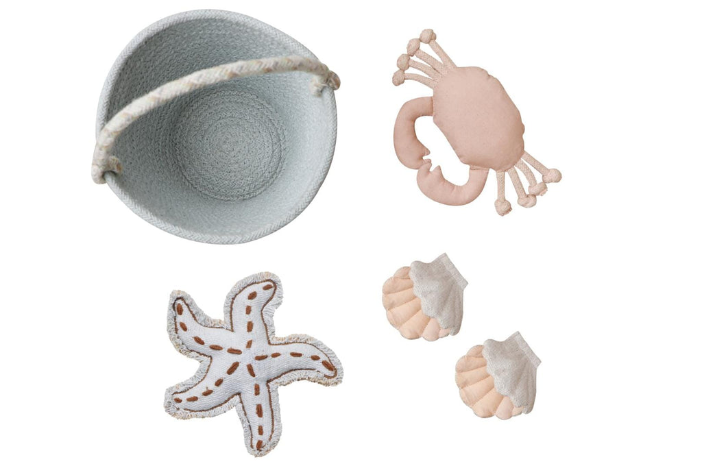 Washable play rug Island from Lorena Canals. This play rug combines shorter and longer yarns in an irregular pattern reminiscent of the soft dunes of a sandy beach. Surrounded by short fringes in a natural and blue colour representing the ocean coast, the rug comes with a set of accessories to play with: a woven basket, a soft crab, a hand-embroidered starfish and two shells with pearls.