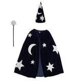 Velvet wizard costume in blue from Meri Meri. The combination of luxurious blue velvet with silver glitter stars and moons makes this costume very special. The wand is covered with a silver glitter fabric star and has a blue velvet ribbon wrapped around the wooden handle. Just put on the cape, put on the hat and wave the starry wand to look like a wizard in seconds. It's perfect for wearing to parties or for imaginative play.