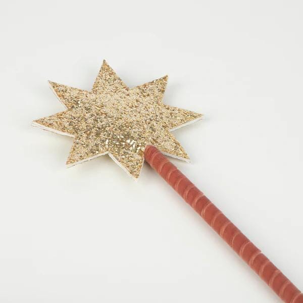Velvet wizard costume in pink by Meri Meri. The combination of luxurious pink velvet with silver glitter stars and moons makes this costume very special. The wand is covered with a silver glitter fabric star and has a pink velvet ribbon wrapped around the wooden handle. Just put on the cape, put on the hat and wave the starry wand to look like a wizard in seconds. It's perfect for wearing to parties or for imaginative play.