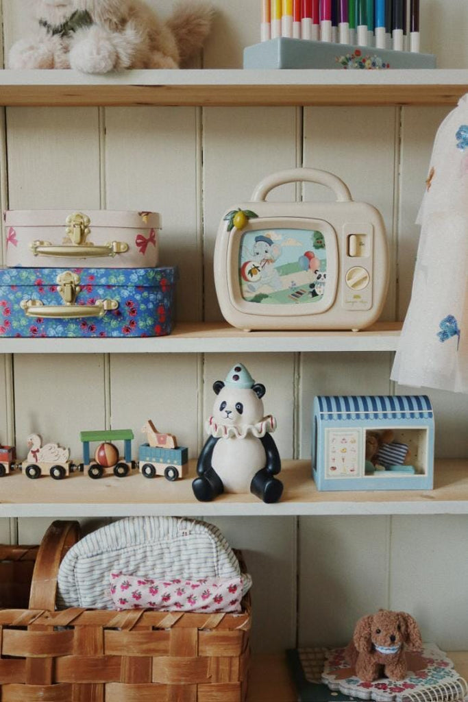 Set of two cardboard toy boxes from Konges Sløjd. Both boxes have a metal handle. The smaller box fits inside the larger one. The larger box has a floral print, while the smaller one has a pretty bow motif.