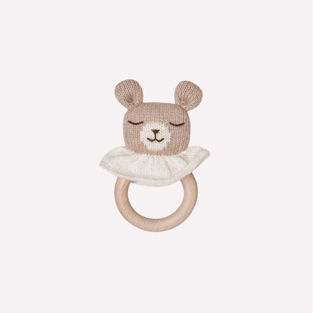 Bijtring van Main Sauvage, om het pijnlijke tandvlees van baby's tijdens de tandjesfase te verlichten. De kleintjes genieten van de ongelooflijke zachtheid en het lieflijke geluid van het belletje. Deze bijtring is gemaakt van pure babyalpacawol en natuurlijk esdoornhout.