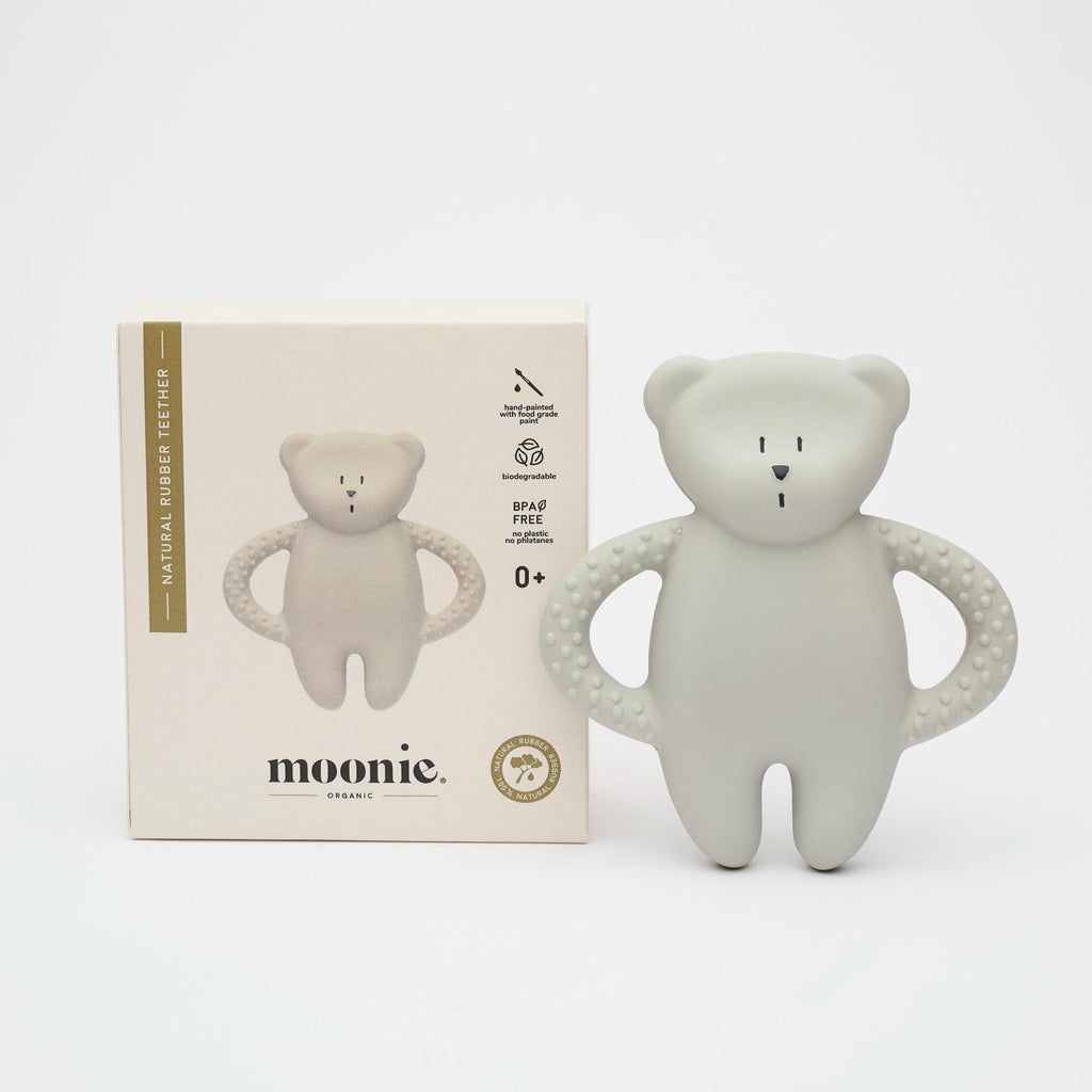 Teether in the colour Gray Natur by Moonie. Moonie's teethers are designed to provide relief during teething and soothe sore gums. The different textures and shapes soothe and stimulate baby, supporting sensory development. The small size and ergonomic shape are perfect for little hands, making the toy easy to grasp and comfortable to use. What's more, they combine nicely with the Moonie Humming bears & bunnies.