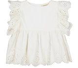 Twis blouse in the colour Cloud from MarMar Copenhagen. This is a blouse made of woven cotton, finished with broderie anglaise. Frons at the sleeves and waist make this piece extra cute! At the back is a full-length back button fastening.