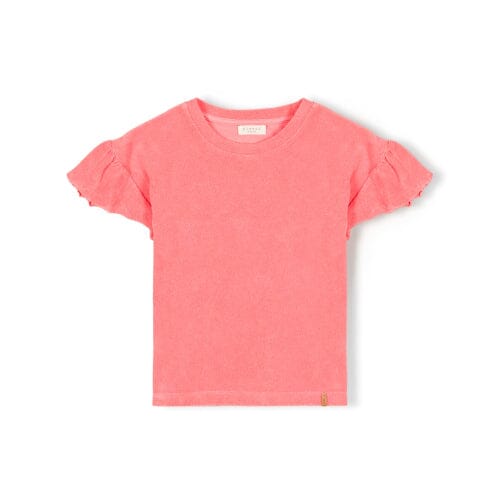 T-shirt uit terrystof in de kleur Coral van Nixnut. Dit shirt heeft leuke vlindermouwtjes met ruffles. Het leren Nixnut labeltje is bevestigd aan de onderkant. Perfect te combineren met de koraalroze Fix short.