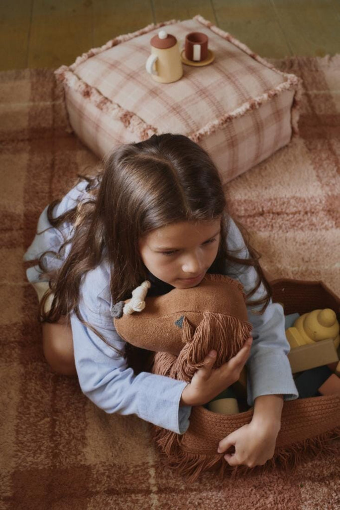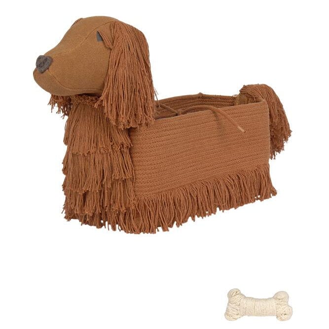 Opbergmand Poppy van Lorena Canals. Maak kennis met Poppy! Een metgezel voor het leven.Deze rechthoekige mand in de vorm van een setterhond is perfect voor het opbergen van je kleine schatten. Hij is handgemaakt van gevlochten koorden van gerecyclede PET-flessenvezels, gemengd met ons toffeekleurige katoen. De oren en staart zijn afgewerkt met gelaagde franjes, terwijl het hoofd en de nek zacht zijn gedetailleerd met geborduurde wimpers en een schattige snuit voor een levensechte uitstraling. Een touw aan de zijkanten helpt de mand in vorm te houden en er zit een klein speelgoedbotje aan het label vast als speelse finishing touch.