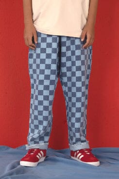 Broek in jeansstof met dambordprint van Nixnut. De elastische taille maakt de broek extra comfortabel. Onderaan de broekspijp is het leren Nixnut labeltje bevestigd.