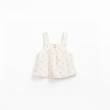 Waffled textured top with floral pattern in Grés colour from Play Up. This top is made from a blend of recycled polyester, recycled cotton and elastane. It is a strappy style with a loose fit, coconut buttons and a wavy hem.