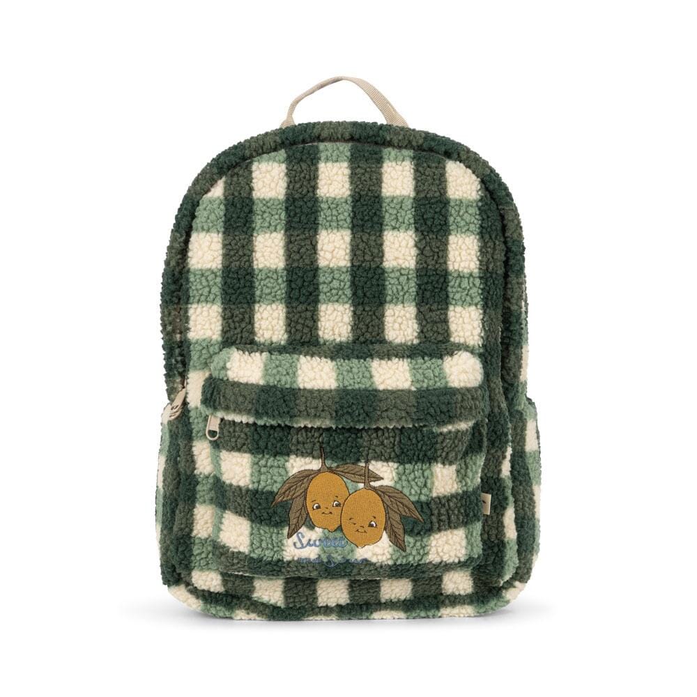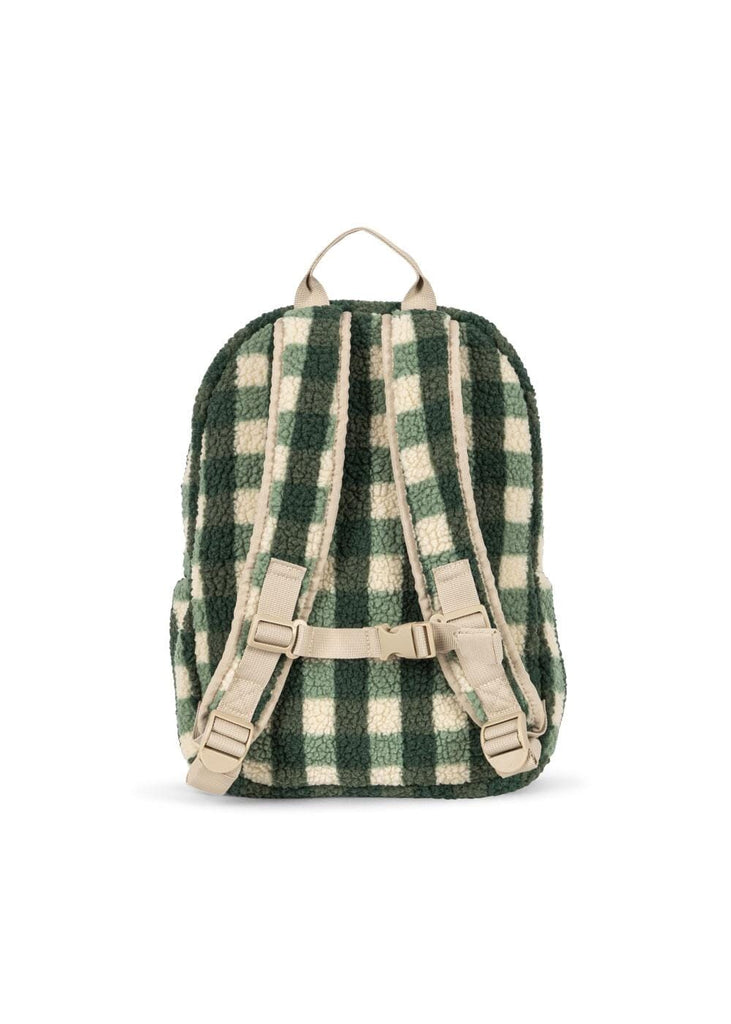 Zachte teddyrugzak met ruitjesprint van Konges Sløjd. Deze rugzak heeft een groot binnenvak, twee zijvakjes, een vakje met ritssluiting vooraaan, verstelbare schouderbanden en een borstriempje voor extra steun.
