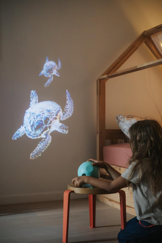 Projecteur d'images Kidystar Planétarium en version vert océan de Kidywolf. Avec KIDYSTAR, la chambre de votre enfant devient magique ! Ce projecteur magique transforme murs et plafonds en un spectacle de lumière féérique grâce à ses 6 disques interchangeables. Le livret pédagogique illustré éveille la curiosité et apaise le sommeil. Une invitation au calme, au rêve et à l'exploration… pour des nuits douces.