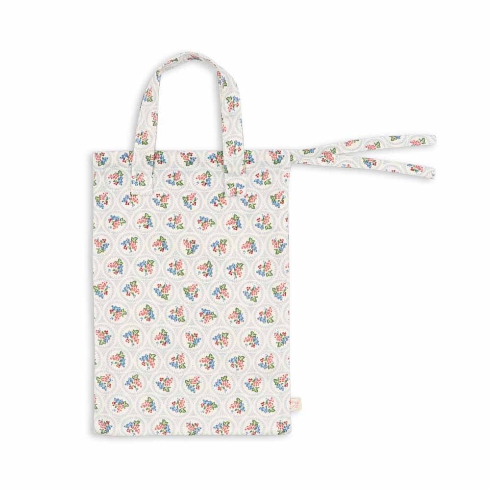 Poppenbeddengoed in de print Verona blues van Konges Sløjd. Ontworpen met zachte biezen. Het beddengoed zit in een bijpassende stoffen tas met een striksluiting.