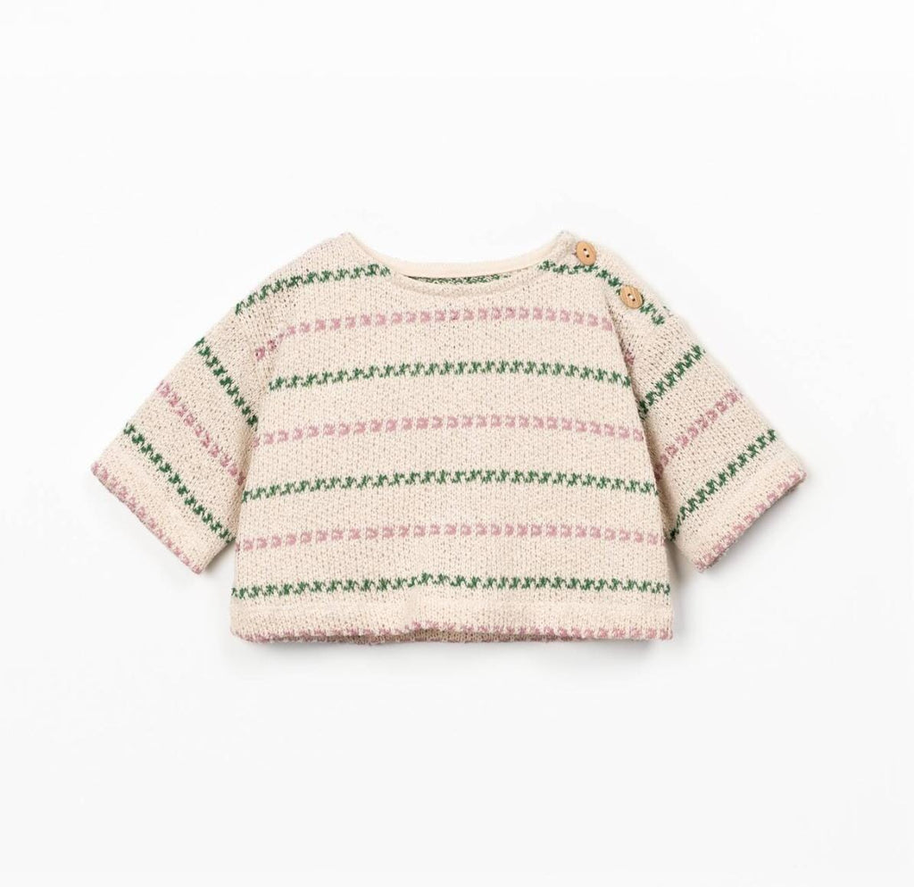 Sweater met roze en groene strepen van Play Up. Dit sweatshirt heeft een ronde halslijn, licht afhangende schouders en een schouderopening met kokosnootknopen. Het is gemaakt uit heerlijk zachte, licht getextureerde stof. Het bevat Re(Play)-garen dat afkomstig is van de recycling van Play Up's post-productie afval.