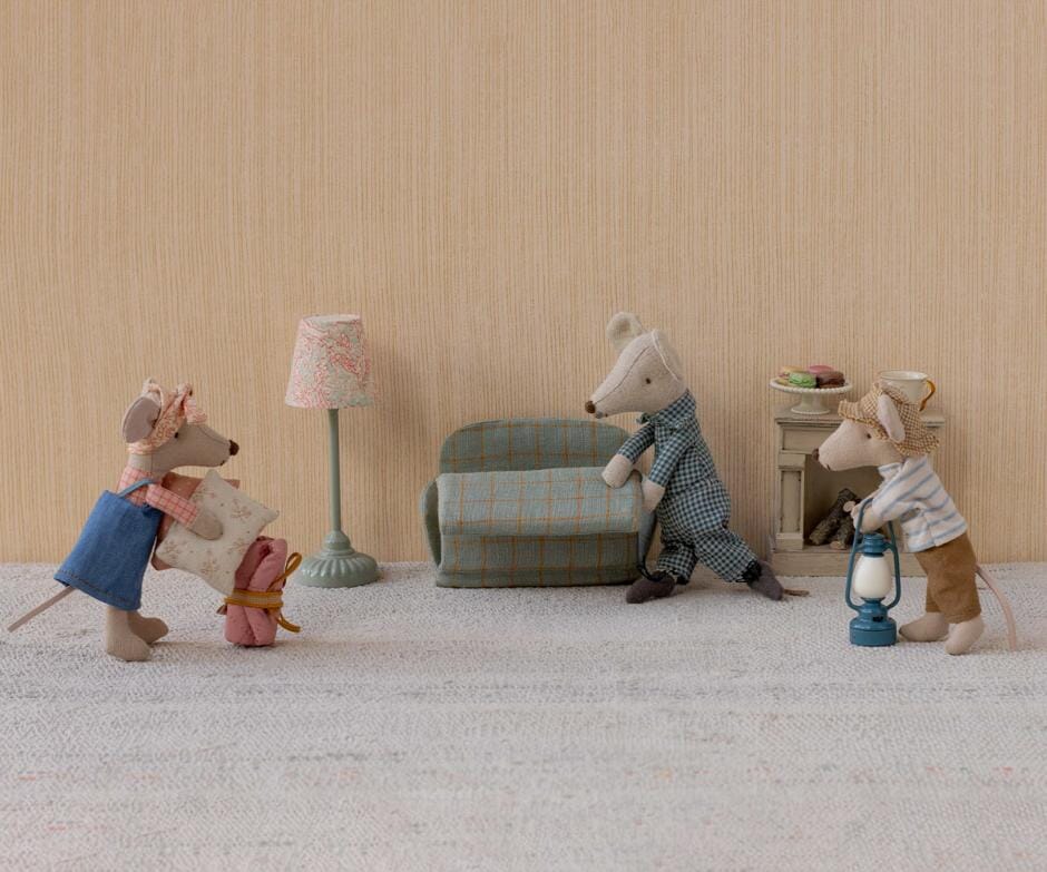 Staande lamp in mintkleur van Maileg. De lamp verlicht de kamer met een zachte gloed - vergeet niet het licht uit te doen als je muizenvrienden naar bed gaan.