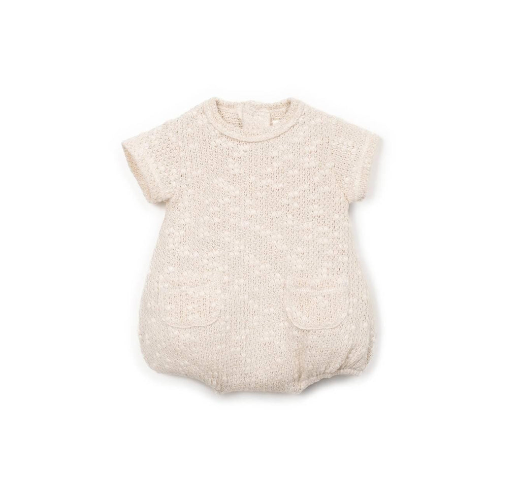 Hij is gemaakt van heerlijk zachte tricot met een mix van katoen en gerecycled katoen. Hij bevat Re(Play)-garen dat afkomstig is van de recycling van Play Up's post-productie afval. Het is een model met korte mouwen, een ronde halslijn, en kokosnootknoopjes. Tussen de beentjes zit een sluiting met drukknopen voor makkelijk aan- en uittrekken.
